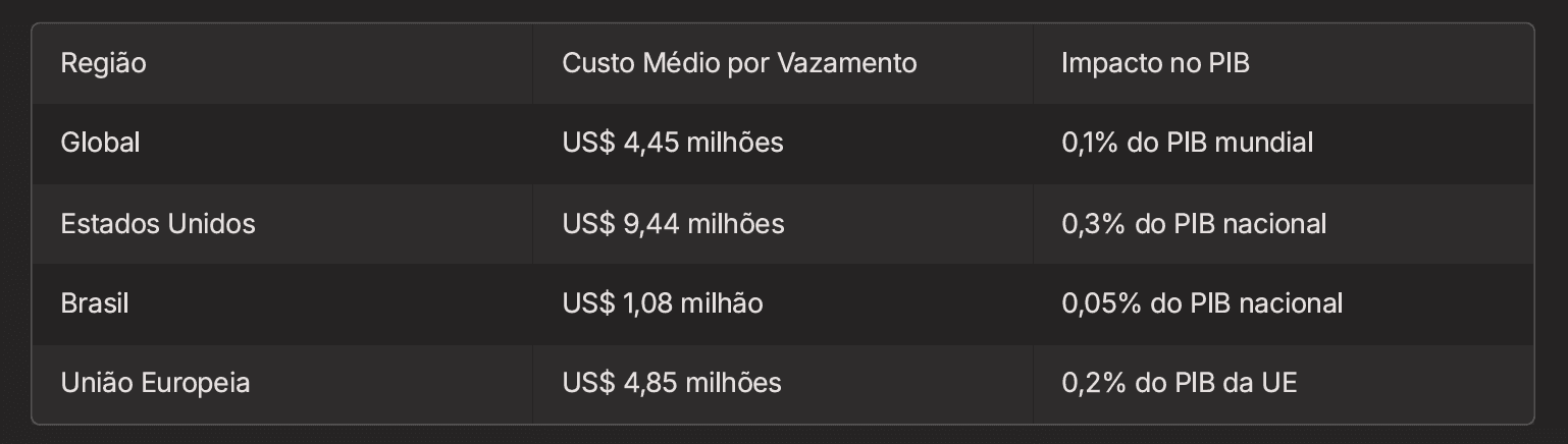 O custo financeiro dos vazamentos de dados é astronômico e continua a crescer. Segundo relatório da IBM em 2023, o custo médio global de um vazamento de dados atingiu a marca impressionante de US$ 4,45 milhões. No Brasil, embora menor, o custo médio ainda é significativo, chegando a US$ 1,08 milhão por incidente. Esses números não são apenas estatísticas frias; eles representam perdas reais que afetam a saúde financeira das organizações, podendo levar pequenas empresas à falência e causar danos duradouros mesmo às grandes corporações.